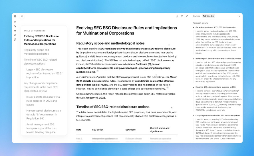 Deep Research w ChatGPT działa analogicznie do trybu o tej samej nazwie w Microsoft Copilot. Potrafi on samodzielnie przeszukiwać sieć, analizować dane i tworzyć szczegółowe raporty z cytowaniami w czasie od kilku do kilkunastu minut, wykraczając ponad możliwości trybu szybkiego. Dotychczasowa technologia, oparta na modelach o3 oraz o4-mini, została w teraz zastąpiona nowym modelem GPT-5.2, co ma zapewnić jeszcze wyższą jakość generowanych opracowań.
