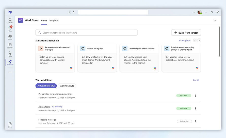 We wrześniu zeszłego roku Microsoft zaczął przeprojektowywać doświadczenie Workflows w Teams, aby jeszcze bardziej ułatwiać automatyzację. Aplikacja zyskała uproszczony interfejs, stając się bardziej pomocna w automatyzowaniu codziennych zadań, takich jak otrzymywanie aktualizacji od członków zespołu, automatyczne kierowanie dokumentów do zatwierdzenia w miarę ich modyfikacji czy dodawanie zadań do Plannera z wiadomości bez opuszczania Microsoft Teams. Środowisko umożliwiło też wykorzystanie szablonów przepływów pracy opartych na AI, by automatyzować zadania z Copilotem lub agentem kanału w podejściu no-code.
